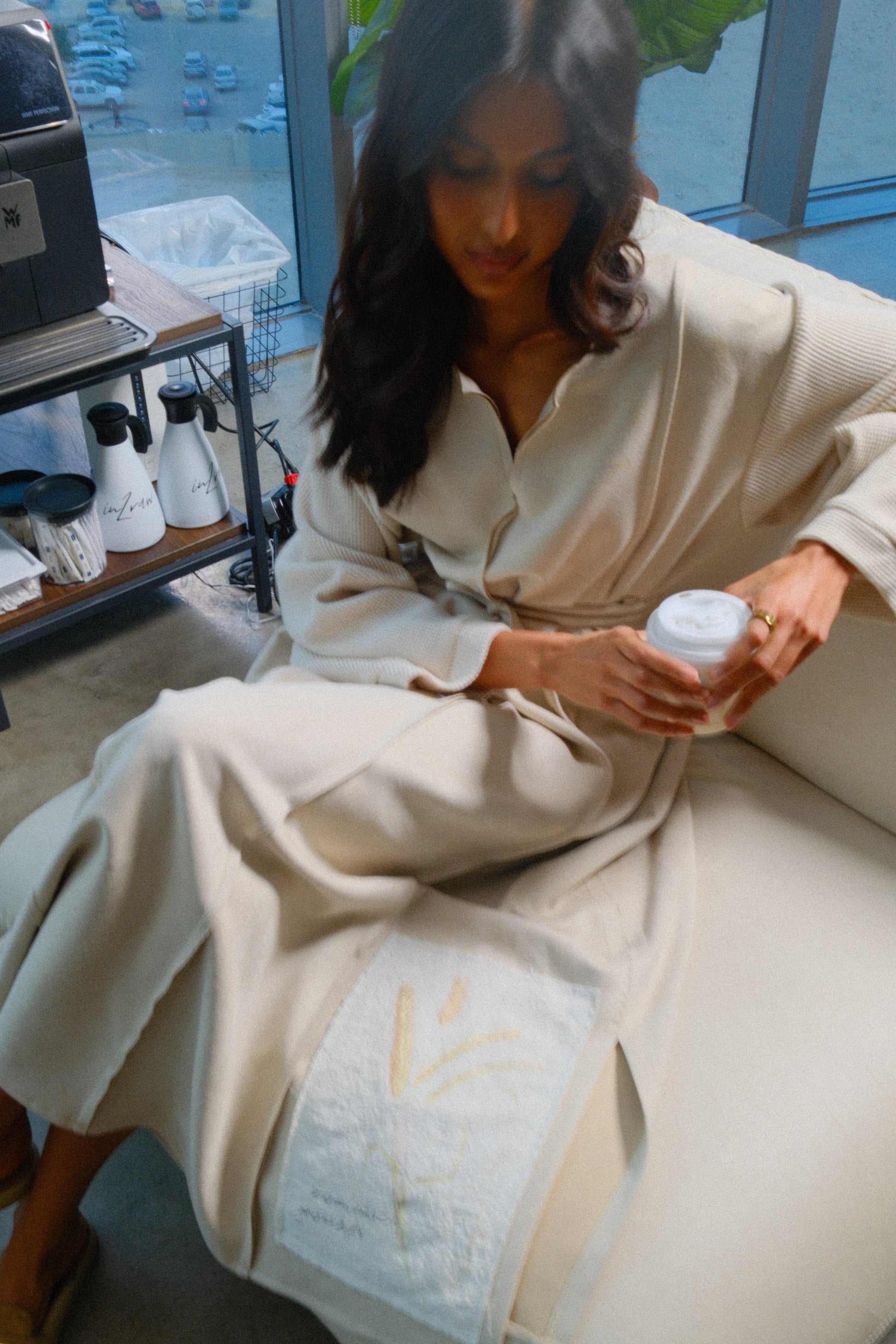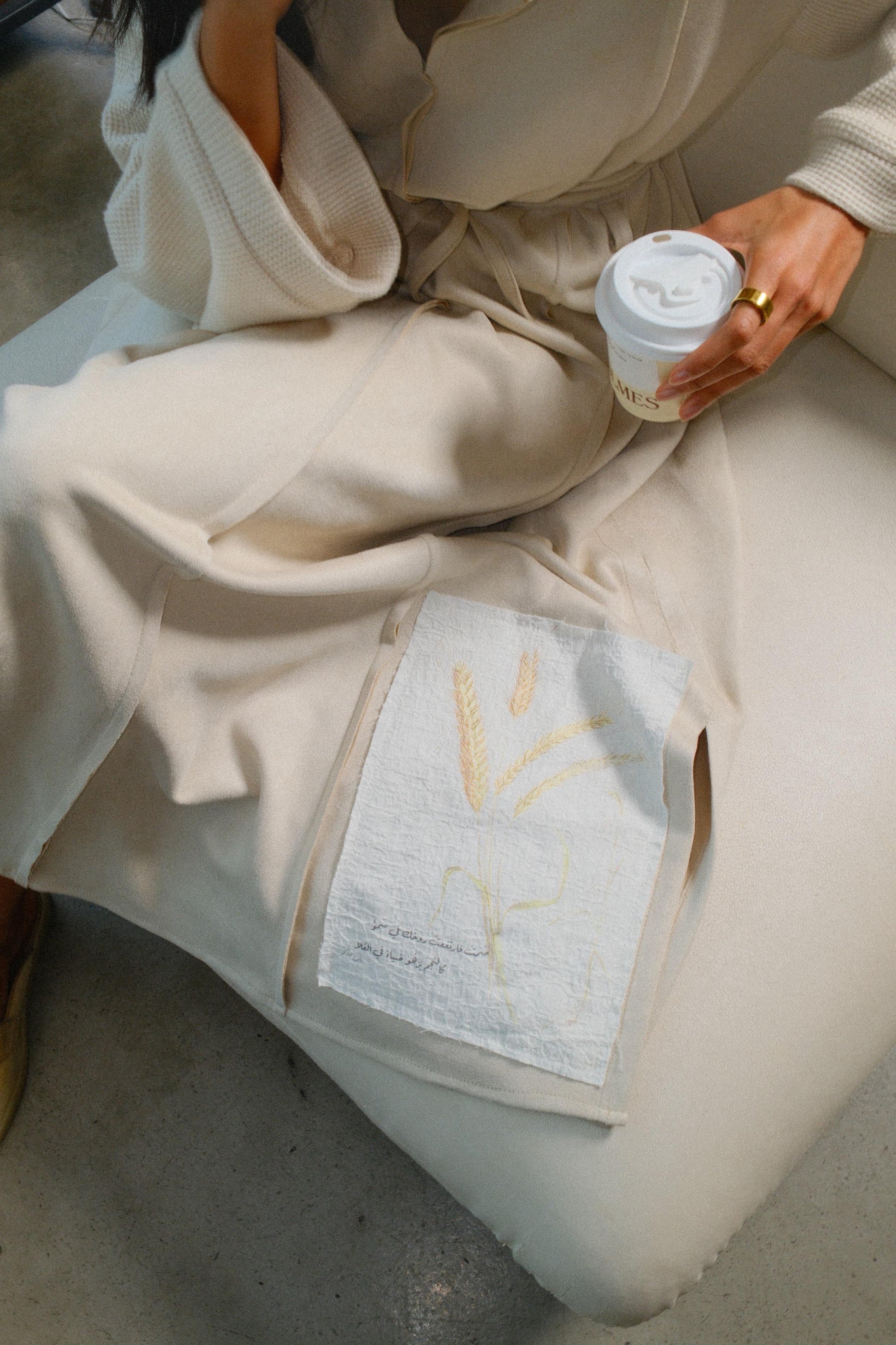 Off white suede dress, with waffle sleeve, a wheat details on bottom right